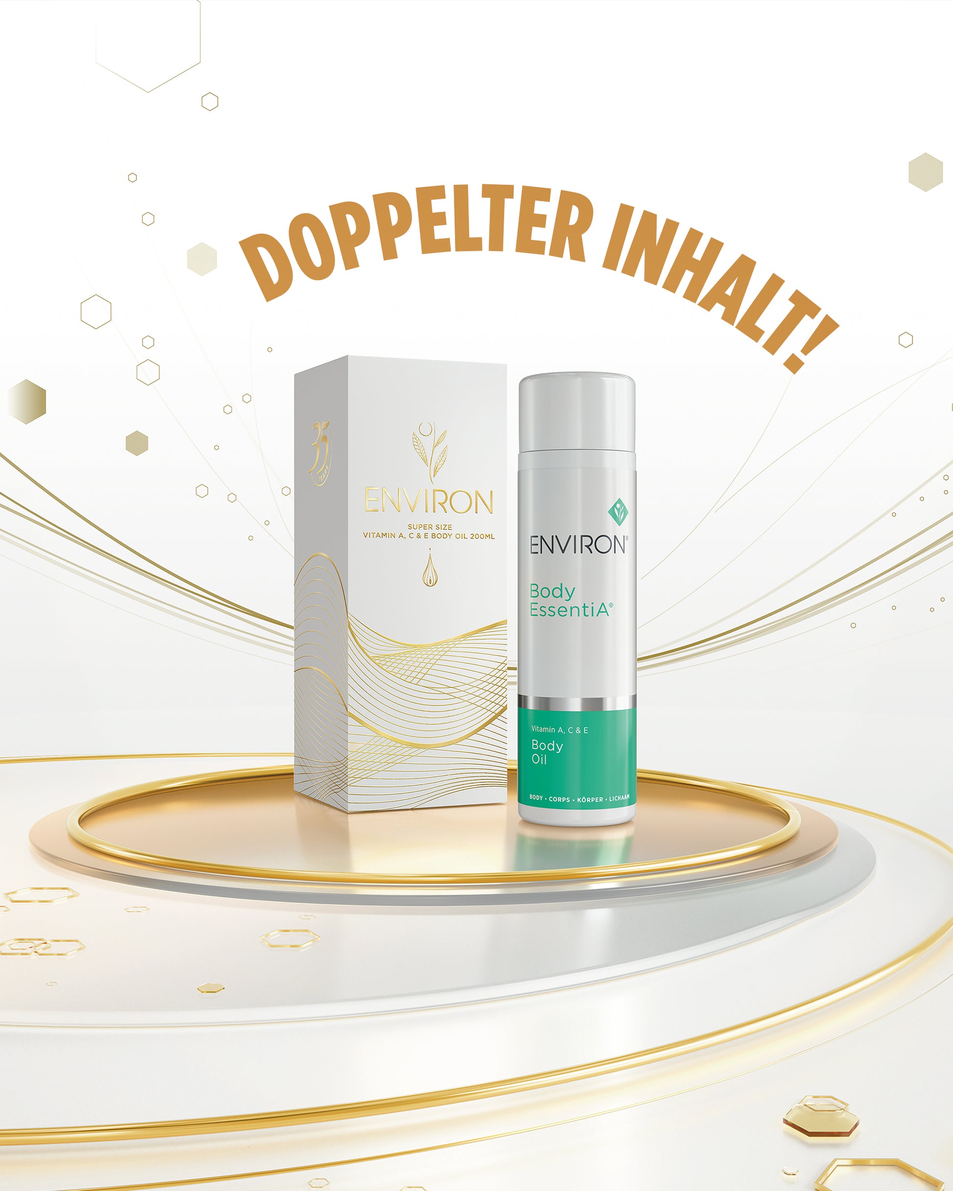 Mit dieser Limited Edition des ENVIRON Body EssentiA Vitamin A, C & E Body Oils erhalten Sie die doppelte Menge Inhalt zum selben Preis der Normalgröße (200 ml statt 100 ml)! Nur solange der Vorrat reicht!