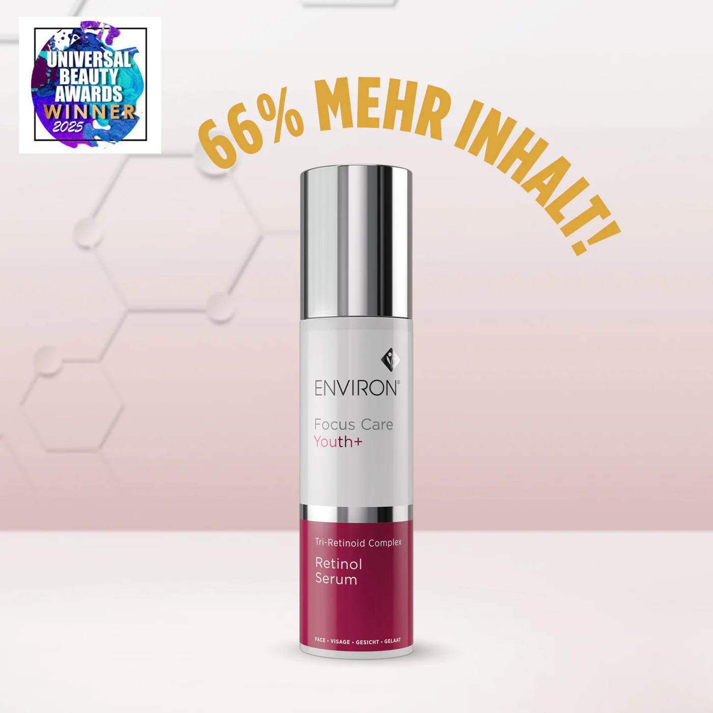 ENVIRON Skin Care nutzt Forschung und Wissenschaft, um intelligente Wirkstoffkombinationen für spezifische Hautprobleme zu entwickeln. Die Retinol-Seren der Focus Care Youth+ Serie enthalten drei Formen von Vitamin A - dem wichtigsten Faktor für die Langlebigkeit der Haut.
